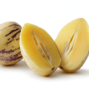 El pepino dulce, también conocido como pepino melón, es una fruta con un aroma suave parecido al melón o al pepino, posee una piel delgada de color cremoso con manchas color purpura, es dulce y refrescante.